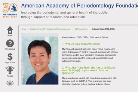 この功績が評価され、2011年アメリカ歯周病学会財団より最も優れた研究者・指導者に贈られるNevins Clinical Research & Teaching Award を授与されました。